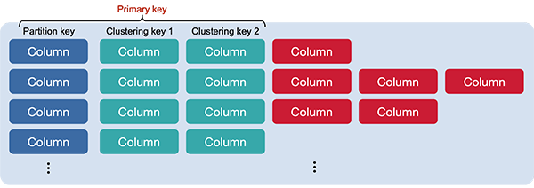 A column is simply key-value data. Related columns are assembled into rows. A row is an ordered collection of columns that is identified by a key. Since Cassandra is a wide-column data store, the set of columns in a row is not preordained and new columns can be added dynamically to any row. The collection of columns in one row may be dramatically different from those in another row. If we think of the collection of rows and columns as a table (a grid), there will be cases where the columns are very sparse: many rows will not have any values for those columns.