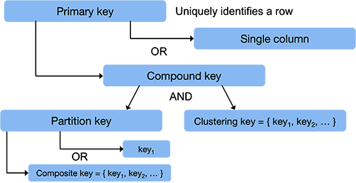 To summarize, data is organized into tables. Each table is broken up into multiple partitions that are spread across the machines in the cluster. The partition key is the column whose value will be hashed to determine which machine stores that particular row (the partition key may be a composite key, in which case it will be a sequence of column names). Within each machine, a partition is sorted by clustering keys, which is a sequence of columns within the row. A primary key is the set of columns that will uniquely identify a row in the table. This is a partition key followed by zero or more clustering keys.