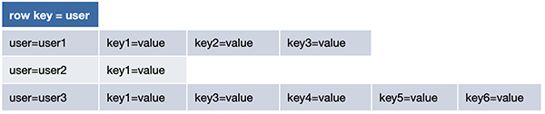 For example a user might have multiple phone numbers that, instead of being stored in a separate table with foreign keys that identify the owner of each number, are co-located with the user's information. Each number is a new column (e.g., phone-1, phone-2, ...). There's also no limit to the number of columns in a row. As we saw with Bigtable, columns might be a list of URLs. In the Bigtable example, a URL of a web page serves as a row key but column names within the URL have names of URLs that contain links to that page and the value of each of those columns contains the link text that appears within the page. We can also consider a related example where a row key identifies a user and each column name is a URL that the user visited and its value is the time of the visit. This is a powerful departure from conventional database fields because the column name itself may be treated as a form of value: by iterating over the columns, one can obtain a list of URLs and then look up their associated value (e.g., link text or time of visit).