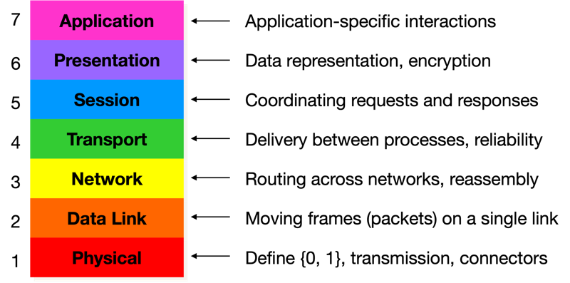 Networking is implemented as a layered stack of protocols, each responsible for a specific function. The most commonly referenced conceptual model is the OSI reference model1, which defines seven layers. While the OSI model does not correspond exactly to any real network stack, it provides a useful vocabulary for reasoning about where functionality lives.