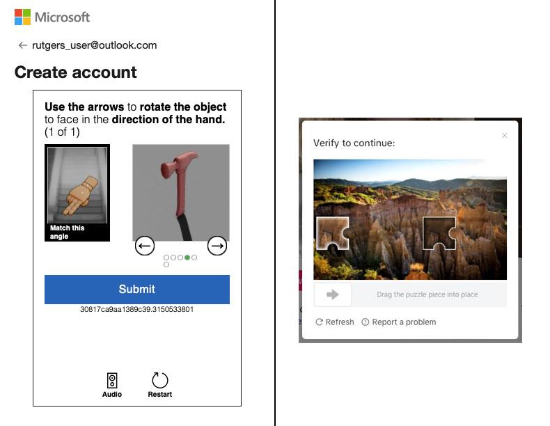 Users were asked to identify all images containing specific objects ("bridges," "buses," "traffic lights") or to drag and drop puzzle pieces into place.